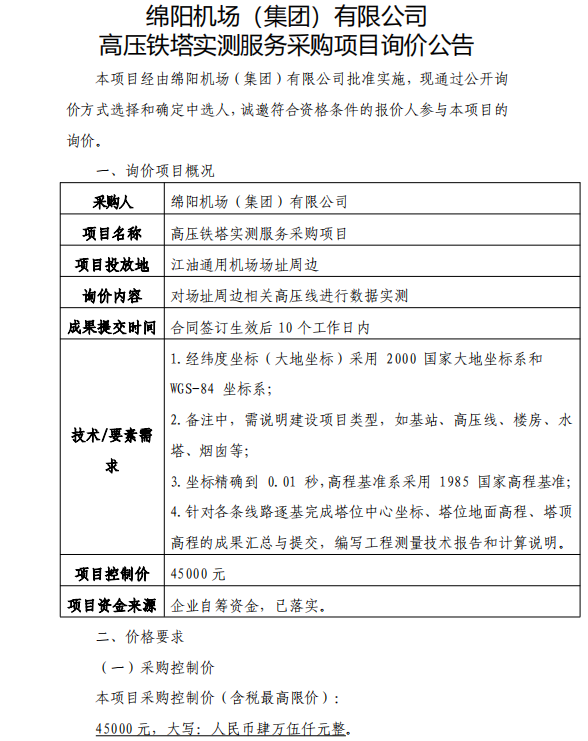 綿陽(yáng)機(jī)場(chǎng)(集團(tuán))有限公司 高壓鐵塔實(shí)測(cè)服務(wù)采購(gòu)項(xiàng)目詢(xún)價(jià)公告