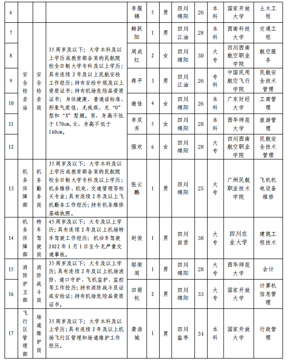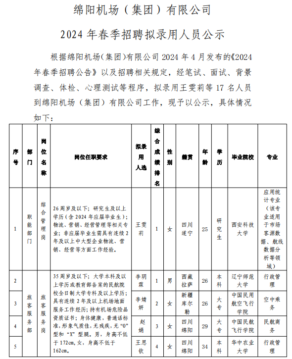 綿陽(yáng)機(jī)場(chǎng)(集團(tuán))有限公司 2024年春季招聘擬錄用人員公示